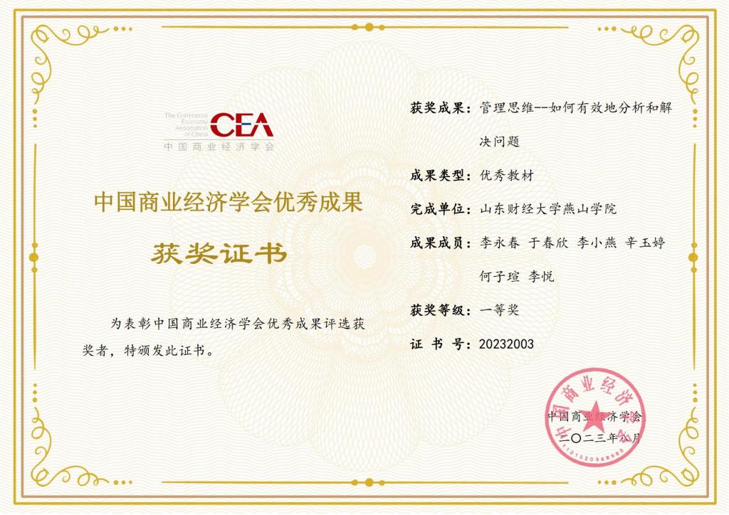 在剛剛結(jié)束的中國(guó)商業(yè)經(jīng)濟(jì)學(xué)會(huì)2023年度優(yōu)秀成果評(píng)獎(jiǎng)活動(dòng)中,由6776永利集團(tuán)院長(zhǎng)李永春教授主編的教材《管理思維---如何有效地分析和解決問題》榮獲優(yōu)秀教材一等獎(jiǎng)。同時(shí),在8月份進(jìn)行的山東省第十五屆大學(xué)生科技節(jié)活動(dòng)中,6776永利集團(tuán)李永春、劉金煒指導(dǎo)的學(xué)生組榮獲山東省大學(xué)生智慧企業(yè)管理創(chuàng)新設(shè)計(jì)大賽數(shù)字商業(yè)企業(yè)模擬經(jīng)營(yíng)對(duì)抗賽道一等獎(jiǎng)。另外,在前不久公布的山東省教育科學(xué)研究院組織的2023年度山東省教育教學(xué)研究課題...